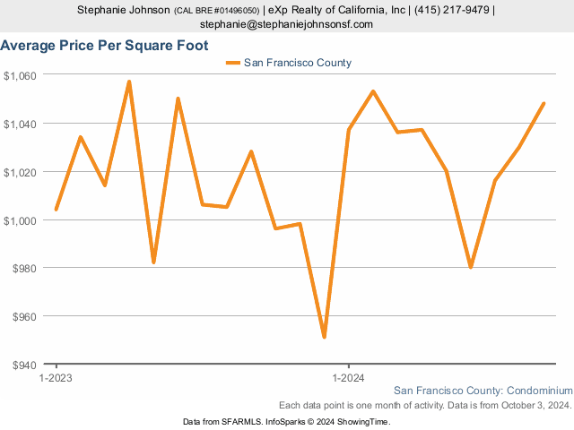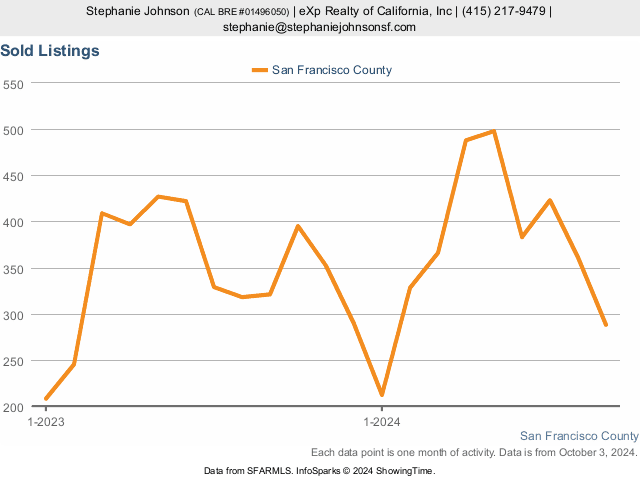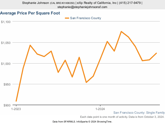 Single family homes in the City continue to out-perform condos. There were 515 single family home sales in the 3rd quarter. These homes sold after an average of 25 days on the market for an average of 112.4% of the list price. The average price paid per square foot for a home in SF increased 5.9% over September 2023 to $1024/sf.