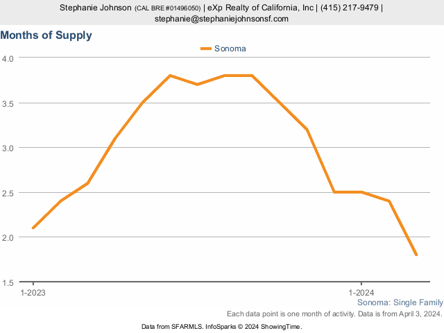 Months Supply of Inventory, Single Family Homes - Sonoma County Through March 2024