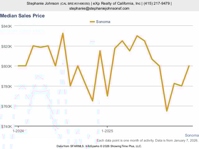 Home prices in Sonoma County started the year modestly, with January’s median sales price at $770,000. As buyer demand picked up and inventory increased, prices climbed steadily through the spring, peaking in May at $830,000.