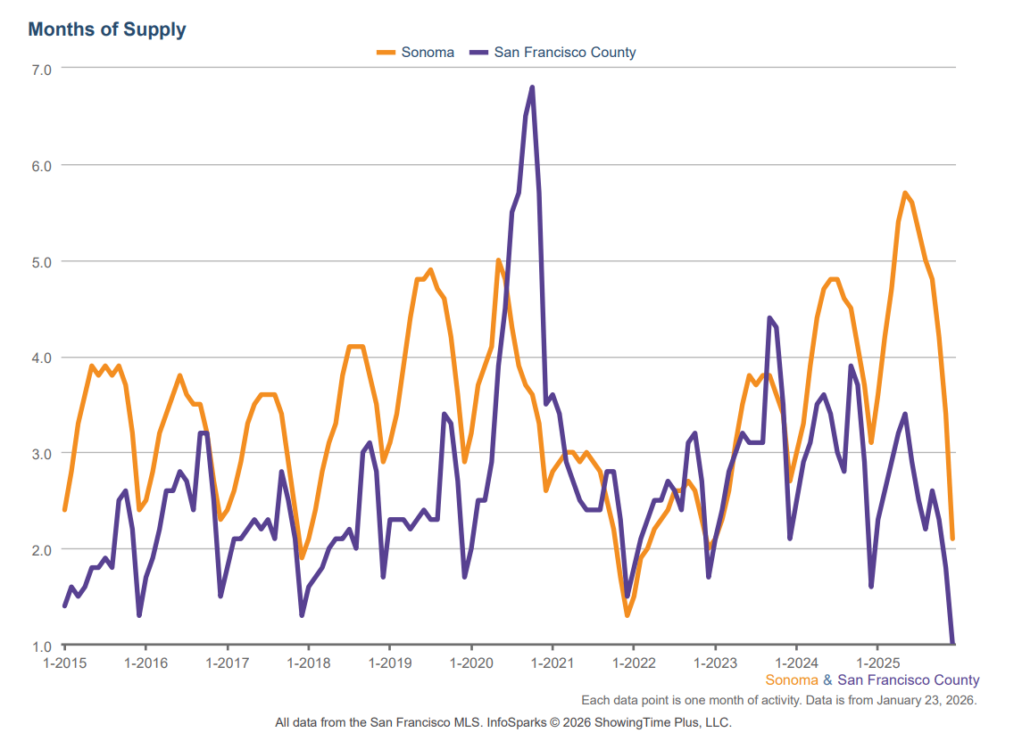From a pure supply standpoint, winter creates some of the lowest inventory levels of the year. In both Sonoma County and San Francisco, fewer homes are listed between November and January, which can benefit sellers simply because there are fewer competing properties.