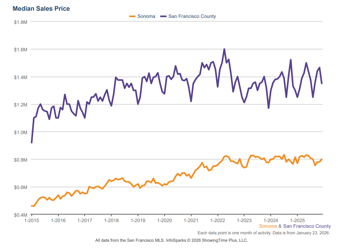 Median Price - Sonoma & San Francisco Counties - Last 10 Years